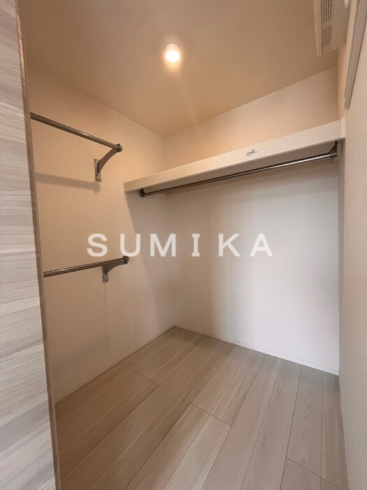 このお部屋のウォークインクローゼットは、とにかく広さと収納力が魅力的です。洋服が多くてもハンガーパイプにきれいに掛けられるので、シワを気にせずお気に入りのワンピースやコートをたっぷり収納できます。バッグや帽子、季節ごとの小物もすっきり整理できるので、毎日のコーディネートがとても楽しくなりそう。足元には衣装ケースを置いたり、棚を工夫すればショップのディスプレイのような空間にすることもできます。クローゼットの中で全身チェックができるので、「今日はどれを着ようかな」と選ぶ時間そのものがワクワクに変わります。自分の好きな物に囲まれて、気持ちよく支度ができるのは女性にとって本当に嬉しいポイントだと思います。