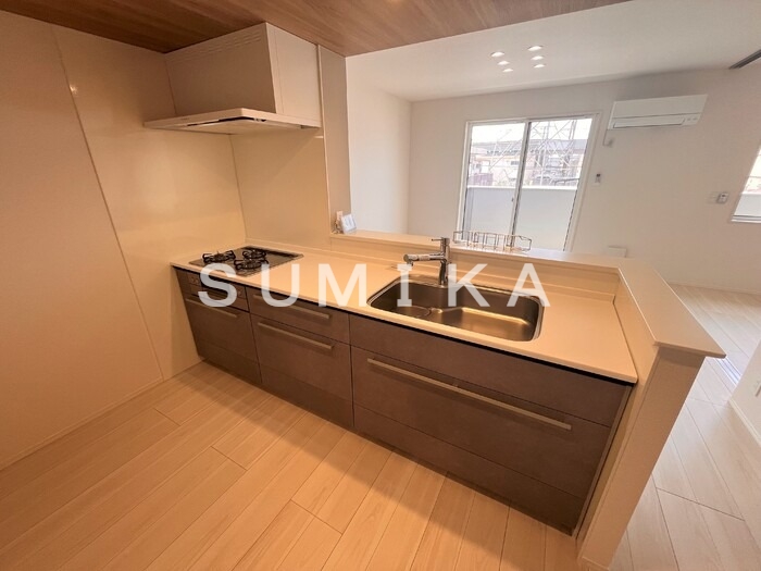 こちらのお部屋のキッチンは、作業スペースが広めに取られていて、ゆったりと料理ができるのが嬉しいポイントです。新築ならではの清潔感があり、毎日の料理やお菓子作りも気分よく取り組んでいただけます。収納も十分にあるので、調味料や調理器具をきちんと整理でき、キッチン周りがすっきり片付くのも魅力です。リビングとつながった配置なので、テレビを見たり家族やパートナーと会話を楽しみながらお料理ができるのも女性にとって嬉しいところです。おしゃれな食器やお気に入りの家電を並べて、自分らしい「キッチン時間」を楽しめる空間です。